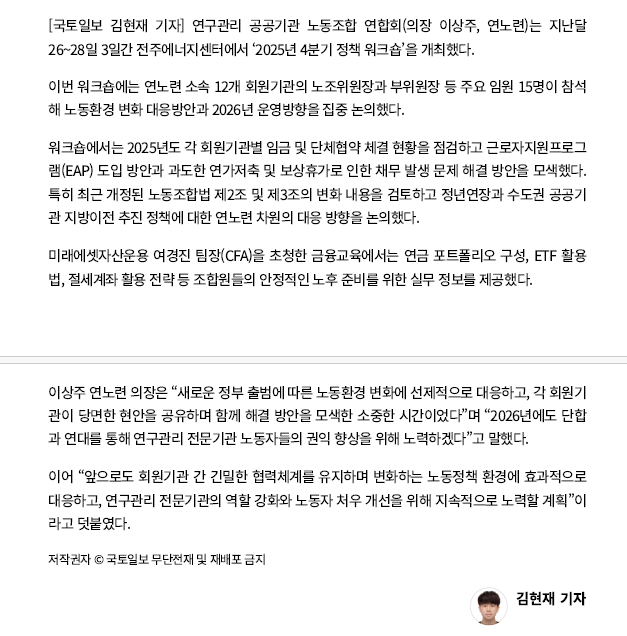 연노련, 4분기 정책 워크숍 개최… 노동환경 변화 대응방안 논의